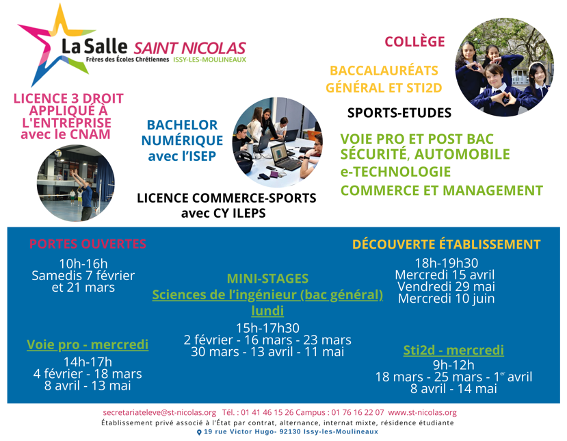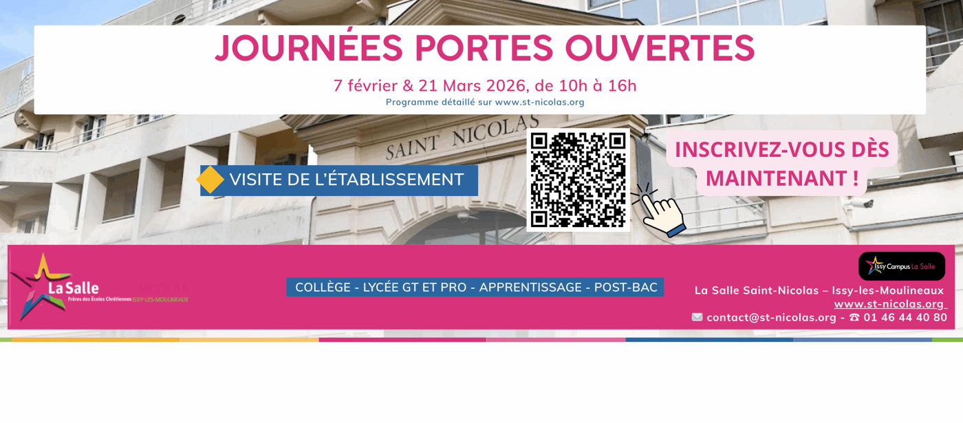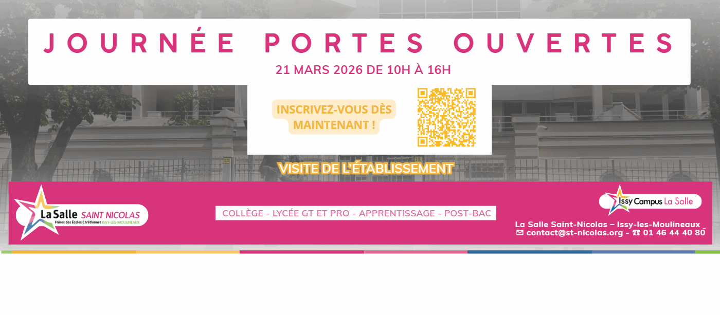 Vous souhaitez découvrir votre futur établissement ? Les Journées Portes Ouvertes du Campus La Salle Saint-Nicolas sont l’occasion de venir découvrir un lieu où l’intelligence se construit dans le lien, l’échange et l’accompagnement. Ces temps de rencontre permettent de mieux comprendre l’esprit de l’établissement, son cadre, ses valeurs et son fonctionnement, dans un environnement bienveillant […]